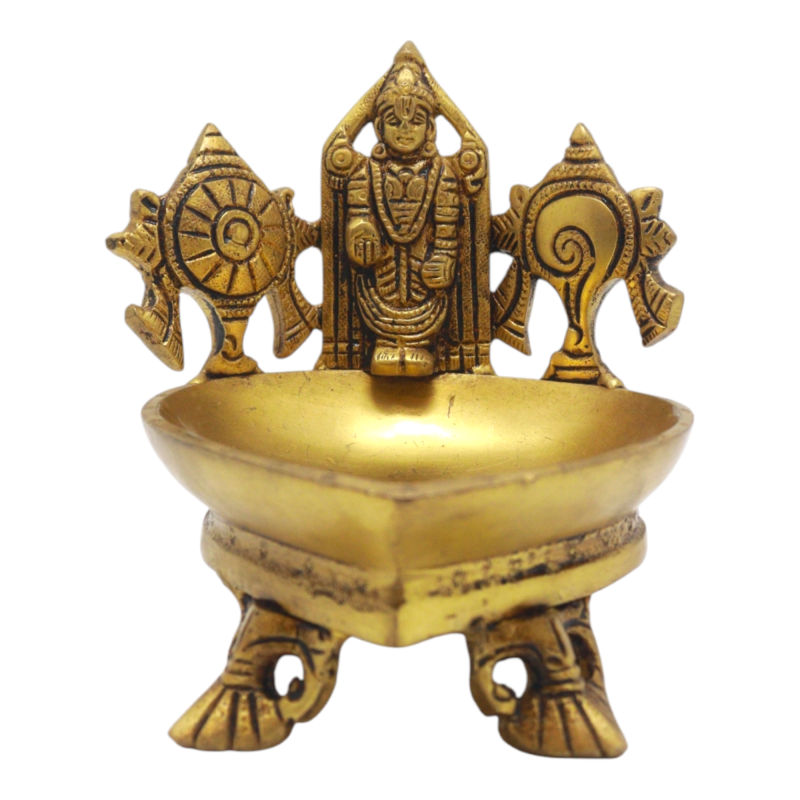 Shanku Chakra Diya SR01757: The Shanku Chakra and Venkateshwara Diya is an elegant brass lamp inspired by the sacred conch (Shanku) and wheel (Chakra). These symbols are associated with spiritual awakening and protection, making this diya an ideal choice for lighting during pooja. Its durable brass construction ensures longevity, while its intricate design adds a divine touch to any space.