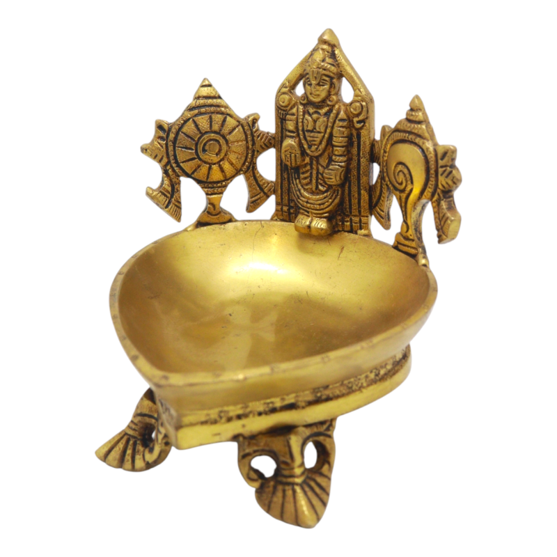 Shanku Chakra Diya SR01757: The Shanku Chakra and Venkateshwara Diya is an elegant brass lamp inspired by the sacred conch (Shanku) and wheel (Chakra). These symbols are associated with spiritual awakening and protection, making this diya an ideal choice for lighting during pooja. Its durable brass construction ensures longevity, while its intricate design adds a divine touch to any space.