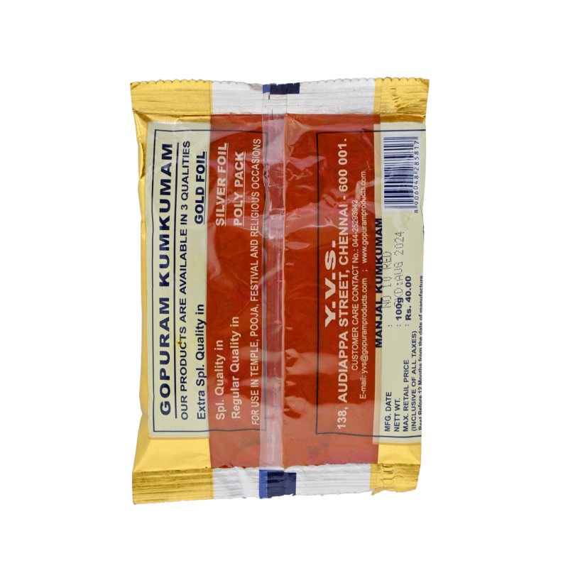 Gopuram Kumkum 100g No 10 Experience the essence of devotion with Gopuram Kumkum No 10, known for its vibrant pure red hue. This Kumkum, crafted from high-quality ingredients, symbolizes purity, energy, and reverence, enhancing the spiritual sanctity of your daily puja rituals. Its rich red color stands as a traditional symbol of auspiciousness, used extensively in religious ceremonies to invoke divine blessings. Perfectly suited for both personal and community offerings, this Kumkum brings a divine aura to your worship space. Compact and convenient, Gopuram Kumkum No 10 is ideal for everyday use, ensuring that your spiritual journey is always vibrant and meaningful.