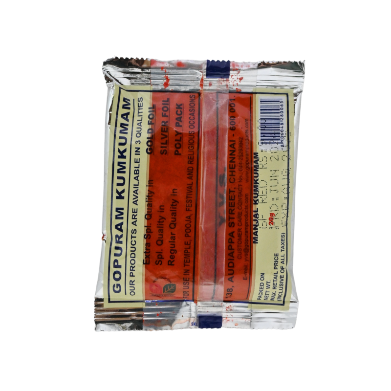 Gopuram Kumkum 20g No 10 Experience the essence of devotion with Gopuram Kumkum No 10, known for its vibrant pure red hue. This Kumkum, crafted from high-quality ingredients, symbolizes purity, energy, and reverence, enhancing the spiritual sanctity of your daily puja rituals. Its rich red color stands as a traditional symbol of auspiciousness, used extensively in religious ceremonies to invoke divine blessings. Perfectly suited for both personal and community offerings, this Kumkum brings a divine aura to your worship space. Compact and convenient, Gopuram Kumkum No 10 is ideal for everyday use, ensuring that your spiritual journey is always vibrant and meaningful.