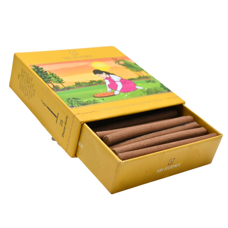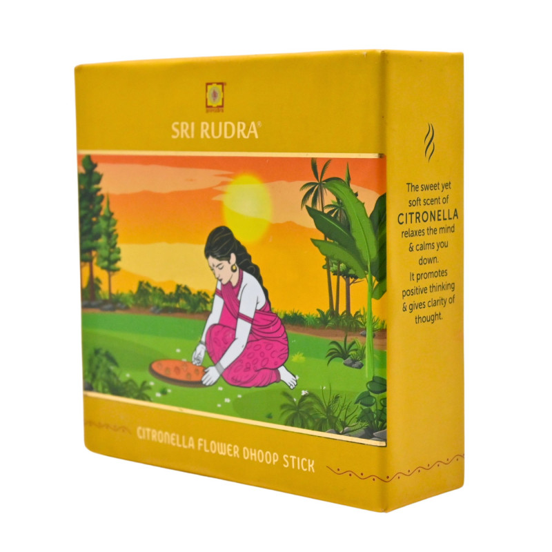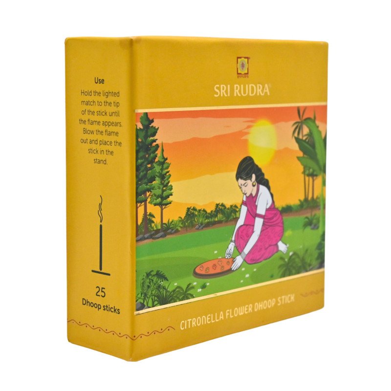 Citronella Flower Dhoop Sticks Elevate your daily puja experience with our Citronella Flower Dhoop Sticks. Infused with the refreshing aroma of citronella, each pack contains 25 expertly crafted dhoop sticks that not only uplift your spiritual ambiance but also help repel unwanted insects. Ideal for both indoor and outdoor use, these dhoop sticks create a serene atmosphere for meditation, yoga, or prayer sessions. The invigorating scent of citronella promotes relaxation, making it perfect for creating a calming environment. Made from high-quality natural ingredients, our dhoop sticks provide a clean, steady burn, allowing you to enjoy the soothing fragrance for hours. Whether for personal use or as a thoughtful gift, our Citronella Flower Dhoop Sticks are a wonderful addition to your daily rituals, enriching your connection with the divine.